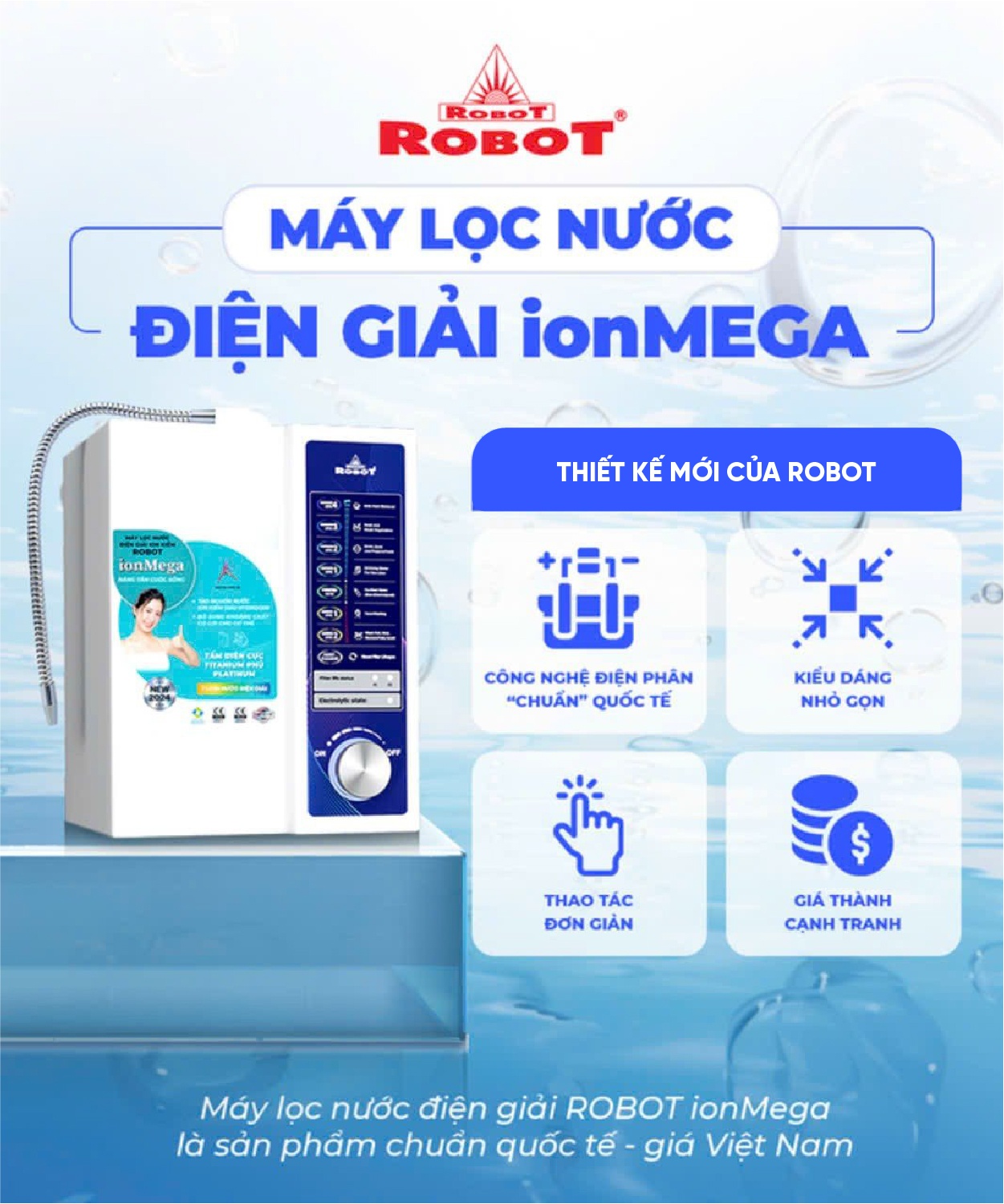 Đặc biệt, Robot đã tung ra "bom tấn" máy lọc nước điện giải ionMega chuẩn quốc tế - giá Việt Nam. Máy có kiểu dáng nhỏ gọn, thao tác đơn giản "lấy nước một lần chạm", cung cấp nhiều loại nước điện giải bất cứ lúc nào đáp ứng nhu cầu sử dụng.