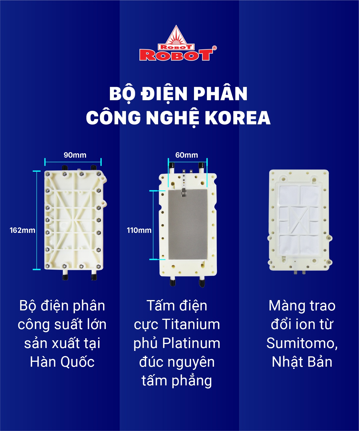 Robot là thương hiệu đầu tiên đã phát minh thêm nhiều chức năng chuyên dụng khác biệt vượt trội cho ngành máy lọc nước, máy lọc nước điện giải ion kiềm, vươn tầm quốc tế với các Kỷ lục châu Á và thế giới, ứng dụng công nghệ và quy chuẩn chất lượng quốc tế vào sản xuất, sản phẩm đạt chứng nhận thiết bị Y tế và An toàn điện châu Âu CE, cung cấp nhiều loại nước điện giải pH đạt chuẩn 24/24, Hydrogen và ORP tối ưu nhất.
