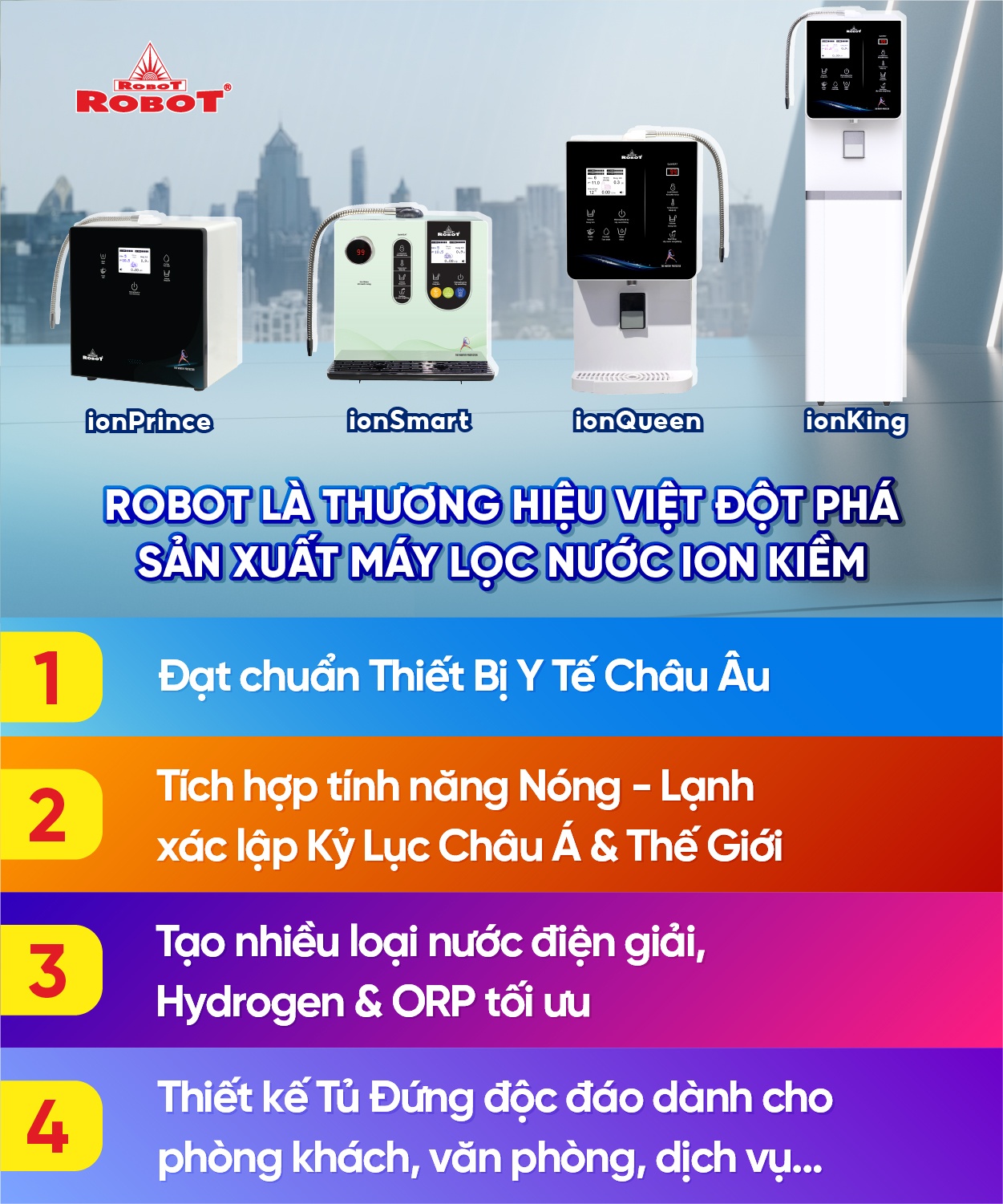 RoBot là thương hiệu Việt đầu tiên tạo ra máy lọc nước điện giải ion kiền đa dạng mẫu mã, chức năng hiện đại đạt tiêu chuẩn quốc tế và xác lập kỷ lục thế giới.
