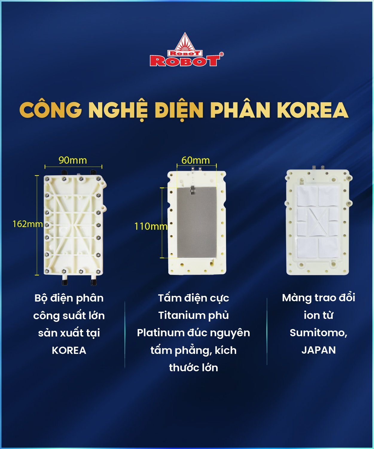 Máy lọc nước điện giải ion kiềm ROBOT là sản phẩm Thế Hệ Mới, được đội ngũ kỹ sư ROBOT phối hợp với các Nhà sản xuất lõi lọc, bộ điện phân chuyên nghiệp hàng đầu ngành điện giải Hàn Quốc thiết kế sản xuất. Với bộ điện phân 3/5/7/9/11/13 tấm điện cực nguyên tấm Titanium phủ Platinum có kích thước lớn đảm bảo hiệu suất điện phân & tạo nước điện giải đúng chuẩn. Titanium cũng là kim loại quý hiếm và gần như là duy nhất được cấp phép cấy vào cơ thể người hay sử dụng trong nha khoa vì không bị ăn mòn kể cả trong môi trường axit mạnh hay kiềm cao. Màng trao đổi ion ngăn cách cực Âm (-) và cực Dương (+) từ Sumitomo, Nhật Bản.