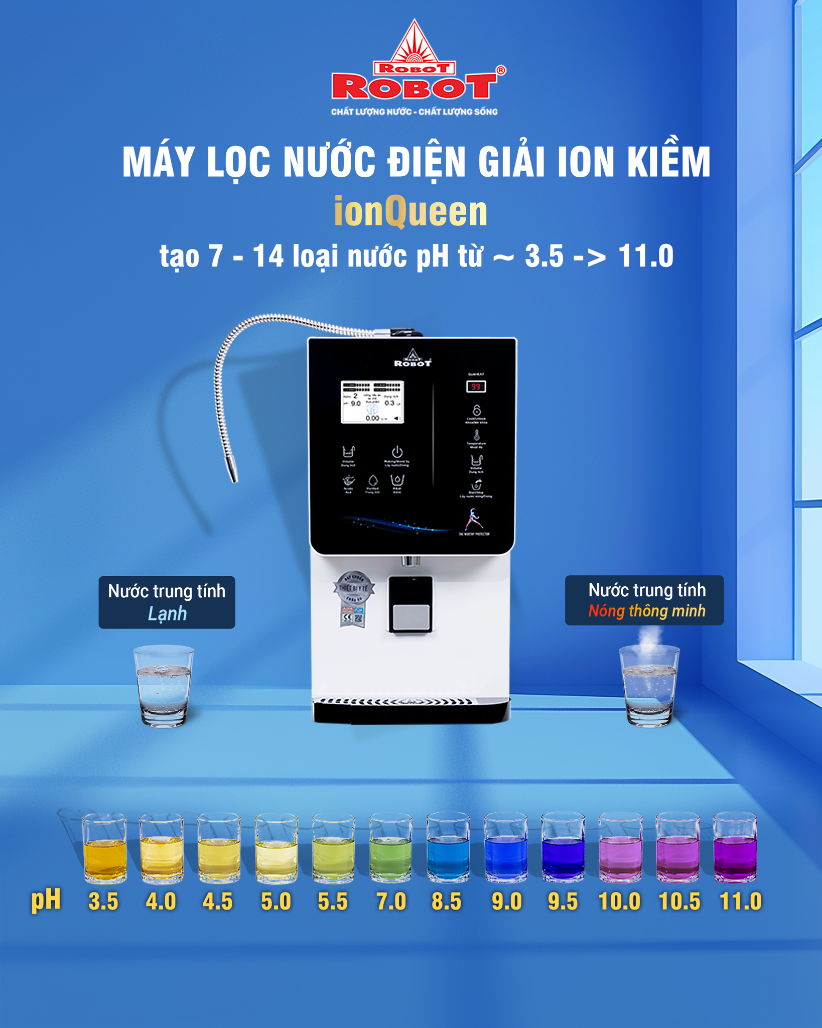 Máy lọc nước điện giải ion kiềm ROBOT tạo 7 - 14 loại nước pH từ ~ 3.5 -> 11.0, Hydrogen & ORP vượt trội lên đến ~ 300 -> 1900 ppb & ~ -250 -> -1100 mV sẽ đồng hành cùng gia đình bạn mỗi ngày, qua từng giọt nước. Sự khác biệt và cải thiện rõ rệt sẽ đến sau thời gian dài sử dụng. Cơ thể trở nên nhẹ nhàng hơn, cảm giác mệt mỏi giảm bớt, vị nước dễ uống. Đó chính là giá trị cốt lõi của một chiếc Máy lọc nước điện giải ion kiềm chăm sóc sức khỏe bền bỉ.