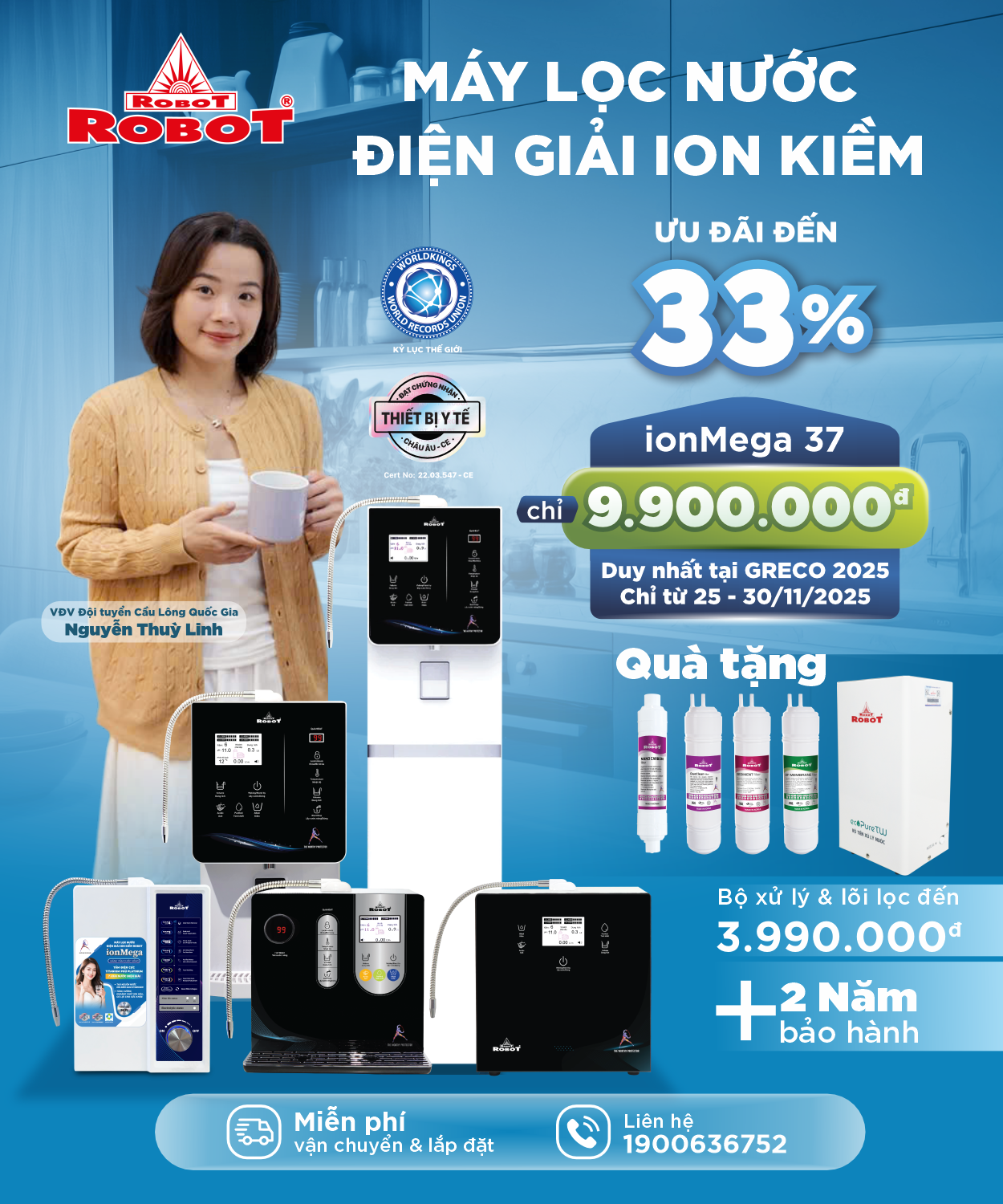 Tham gia GRECO 2025, ROBOT mang đến chương trình ưu đãi lớn trong năm với mức ưu đãi lên đến 33% cho các sản phẩm Máy lọc nước điện giải ion kiềm và 20% cho Máy lọc nước RO, áp dụng duy nhất tại sự kiện từ ngày 25 đến 30/11/2025. Đây không chỉ là hoạt động tri ân khách hàng mà còn thể hiện mong muốn của ROBOT: để ngày càng nhiều gia đình Việt được tiếp cận với công nghệ nước tốt tiêu chuẩn quốc tế ở mức chi phí hợp lý.