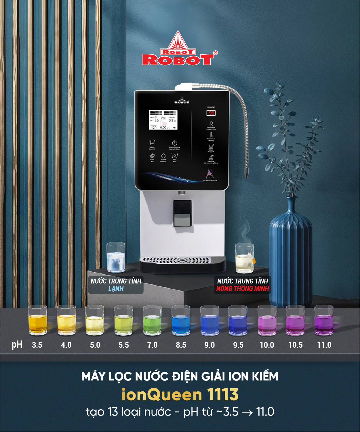 Máy lọc nước điện giải ion kiềm ROBOT ionQueen 1113 là model đặc biệt sản xuất với công nghệ điện phân tiên tiến, cao cấp trang bị đến 11 tấm điện cực kích thước lớn, có khả năng tạo ra đến 13 loại nước đa chức năng: