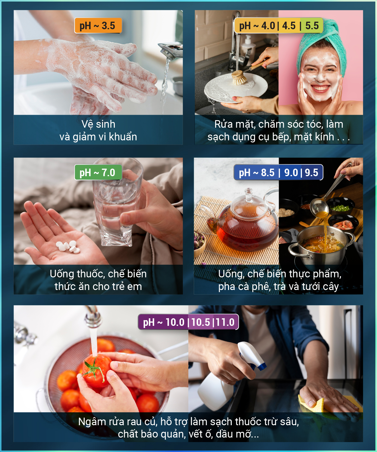 - Nước điện giải ion kiềm được tạo từ thiết bị điện phân ion hóa nước, tạo nhiều mức nước có pH, Hydrogen, ORP khác nhau với nhiều công năng sử dụng, không phải là thuốc và không có tác dụng thay thế thuốc chữa bệnh.