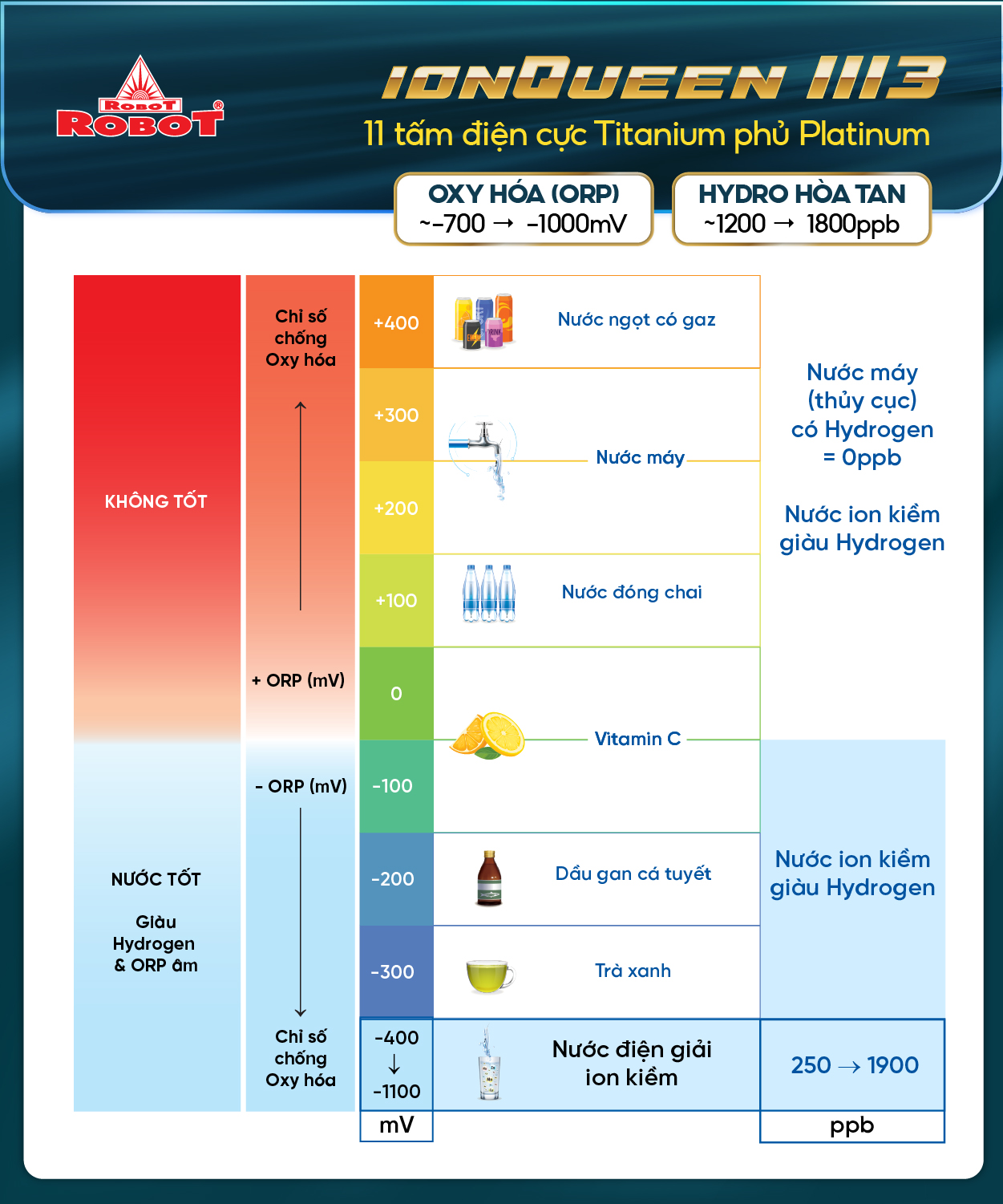 I/ ionQueen 1113 tạo 13 loại nước bổ ích, Hydrogen & ORP vượt trội lên đến ~ 1200 -> 1800 ppb & ~ -700 -> -1000 mV