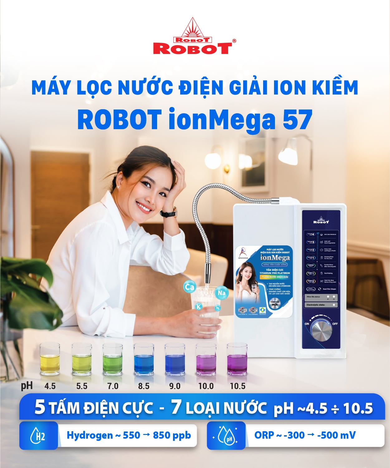 - ROBOT ionMega 57 được nhà sản xuất ưu đãi với mức giá hấp dẫn, hợp lý trong các dòng máy điện giải cao cấp chuẩn quốc tế trên thị trường, mục đích để người dùng Việt Nam dễ dàng tiếp cận sử dụng nguồn nước ion kiềm quý giá, nâng cao chất lượng cuộc sống, sẵn sàng sử dụng thay thế ngay các máy lọc nước thông thường.