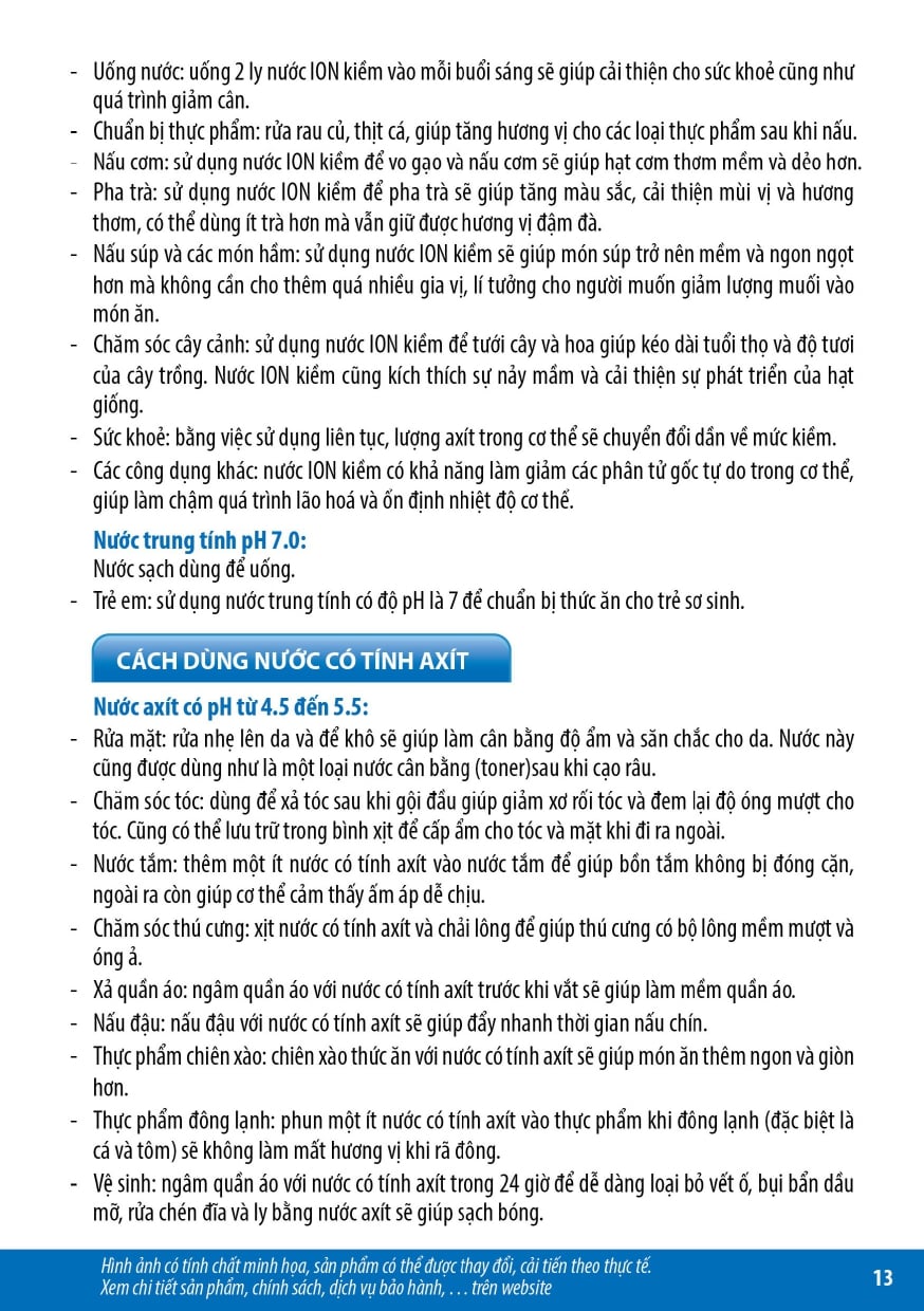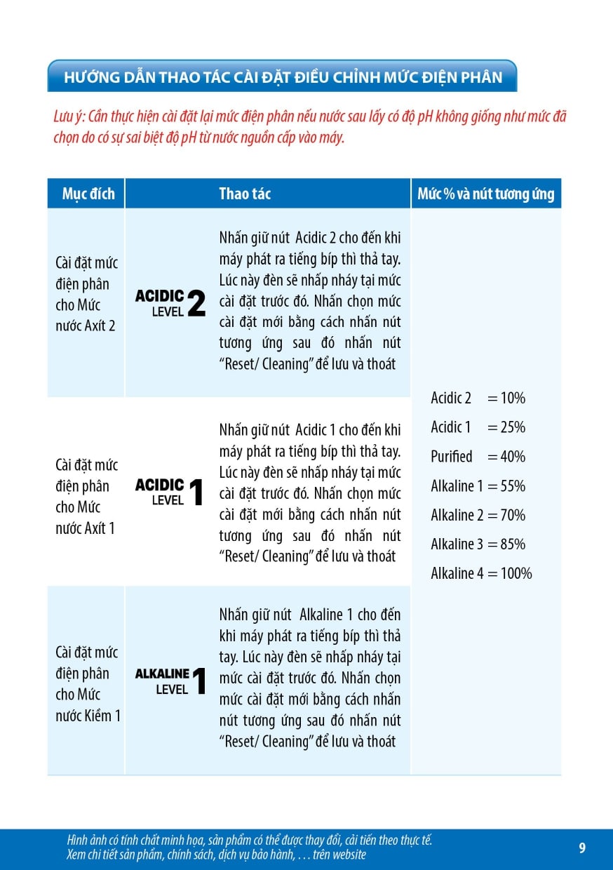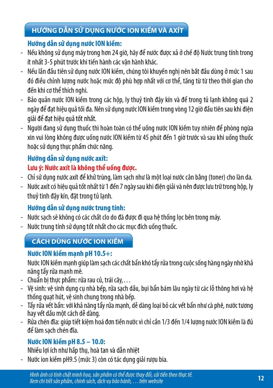 - Nước điện giải ion kiềm được tạo từ thiết bị điện phân ion hóa nước, tạo nhiều mức nước có pH, Hydrogen, ORP khác nhau với nhiều công năng sử dụng, không phải là thuốc và không có tác dụng thay thế thuốc chữa bệnh.