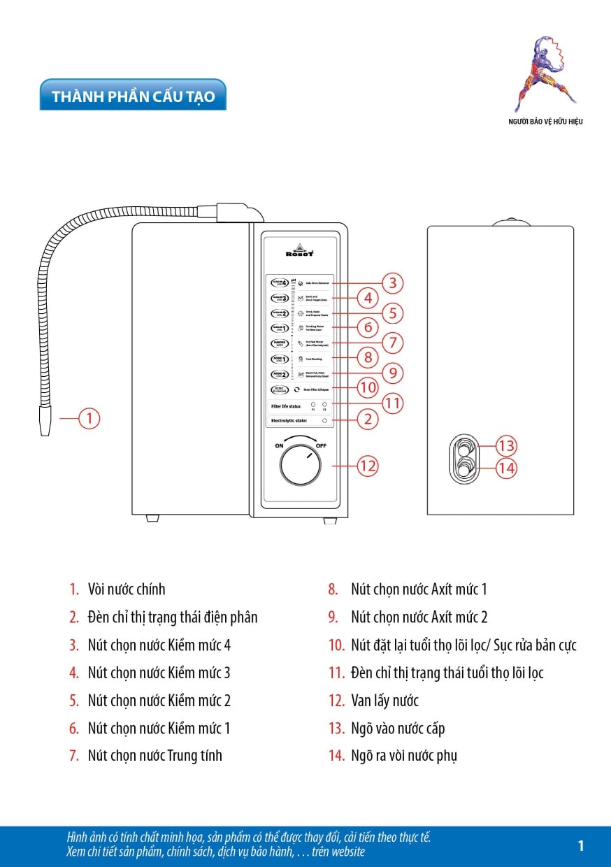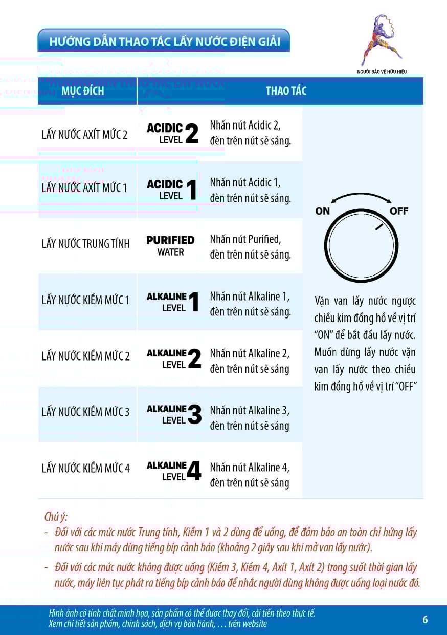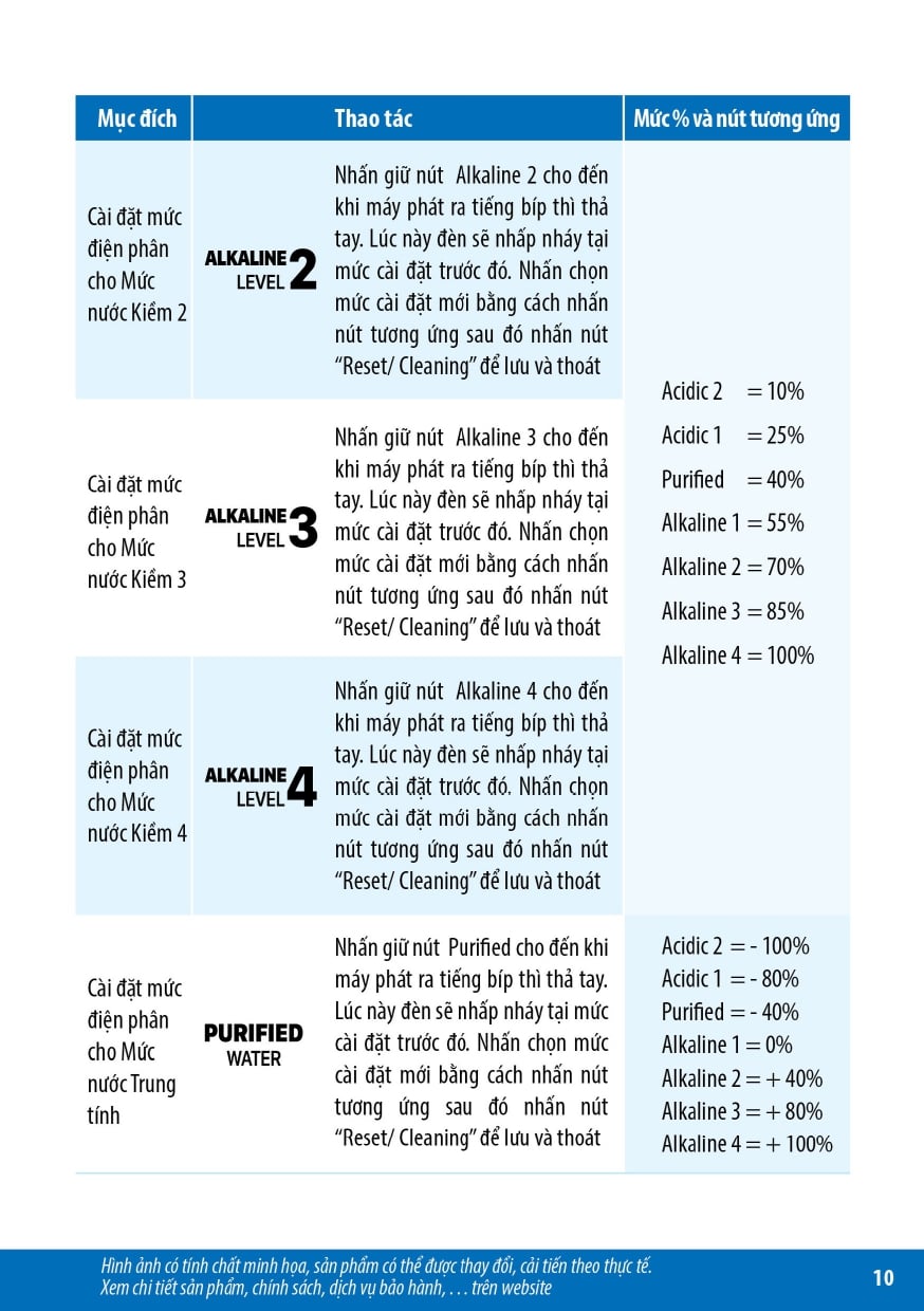 - Nước điện giải ion kiềm được tạo từ thiết bị điện phân ion hóa nước, tạo nhiều mức nước có pH, Hydrogen, ORP khác nhau với nhiều công năng sử dụng, không phải là thuốc và không có tác dụng thay thế thuốc chữa bệnh.