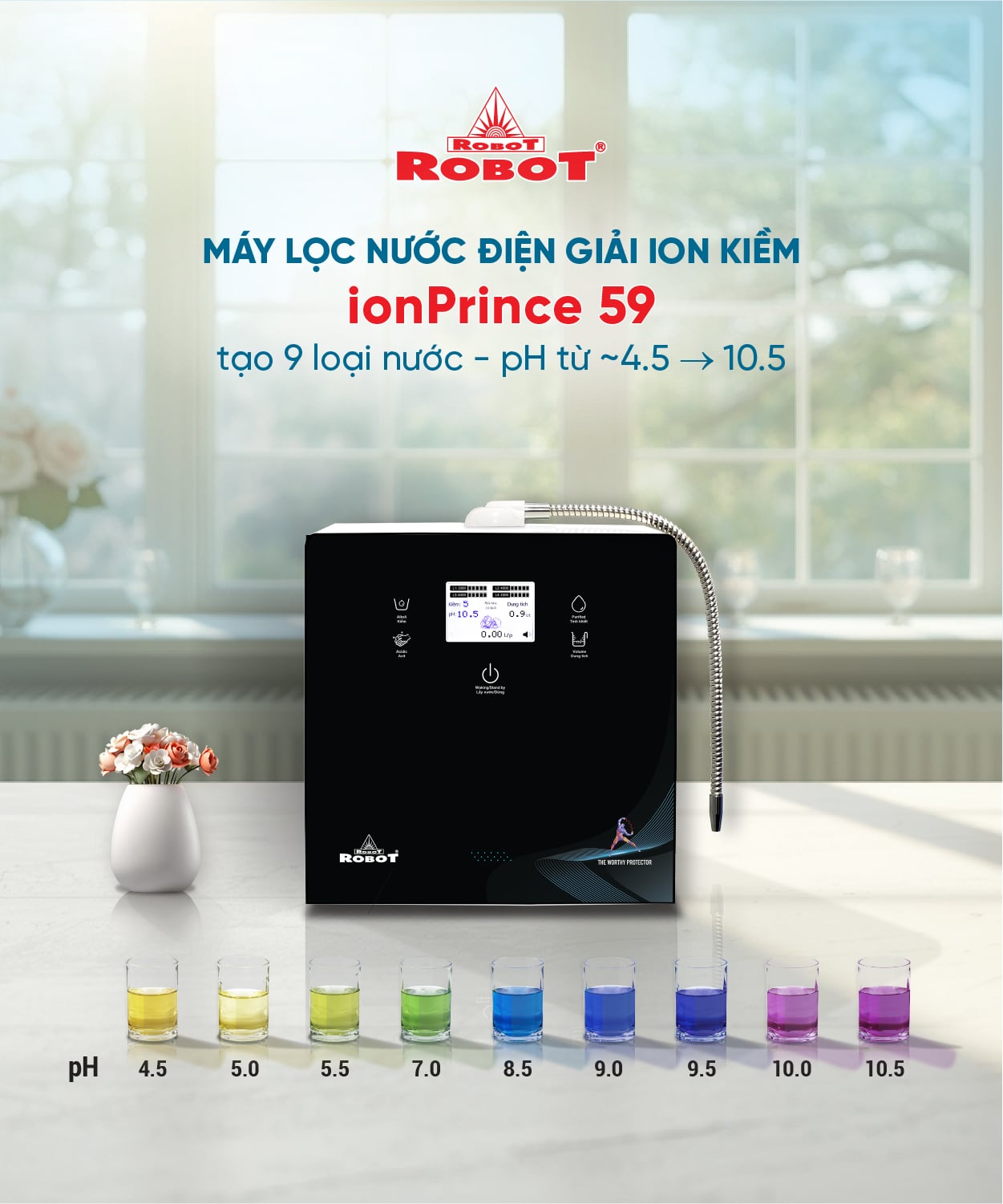 Máy lọc nước điện giải ion kiềm ROBOT ionPrince 59 là model đặc biệt sản xuất với công nghệ điện phân tiên tiến, cao cấp trang bị đến 5 tấm điện cực kích thước lớn, có khả năng tạo ra đến 9 loại nước đa chức năng: