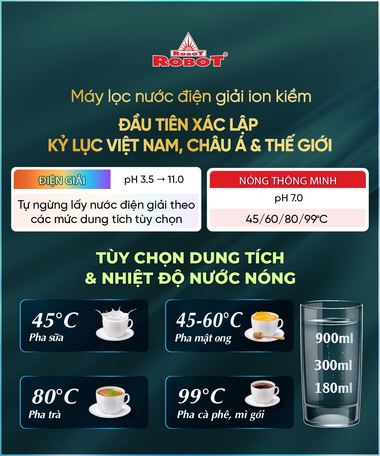 Đặc biệt, ROBOT là nhà sản xuất đầu tiên trên thế giới sản xuất dòng Máy lọc nước điện giải có thêm chức năng tạo nước Nóng thông minh, tùy chọn dung tích và nhiệt độ nước nóng các mức 45/60/80/99 độ C, lấy ngay lập tức không cần đun nấu và chức năng nước Lạnh từ 10-12 độ C, đạt Kỷ Lục Việt Nam, Châu Á và Thế Giới (tham khảo thông tin các model ionSmart, ionQueen, ionKing).