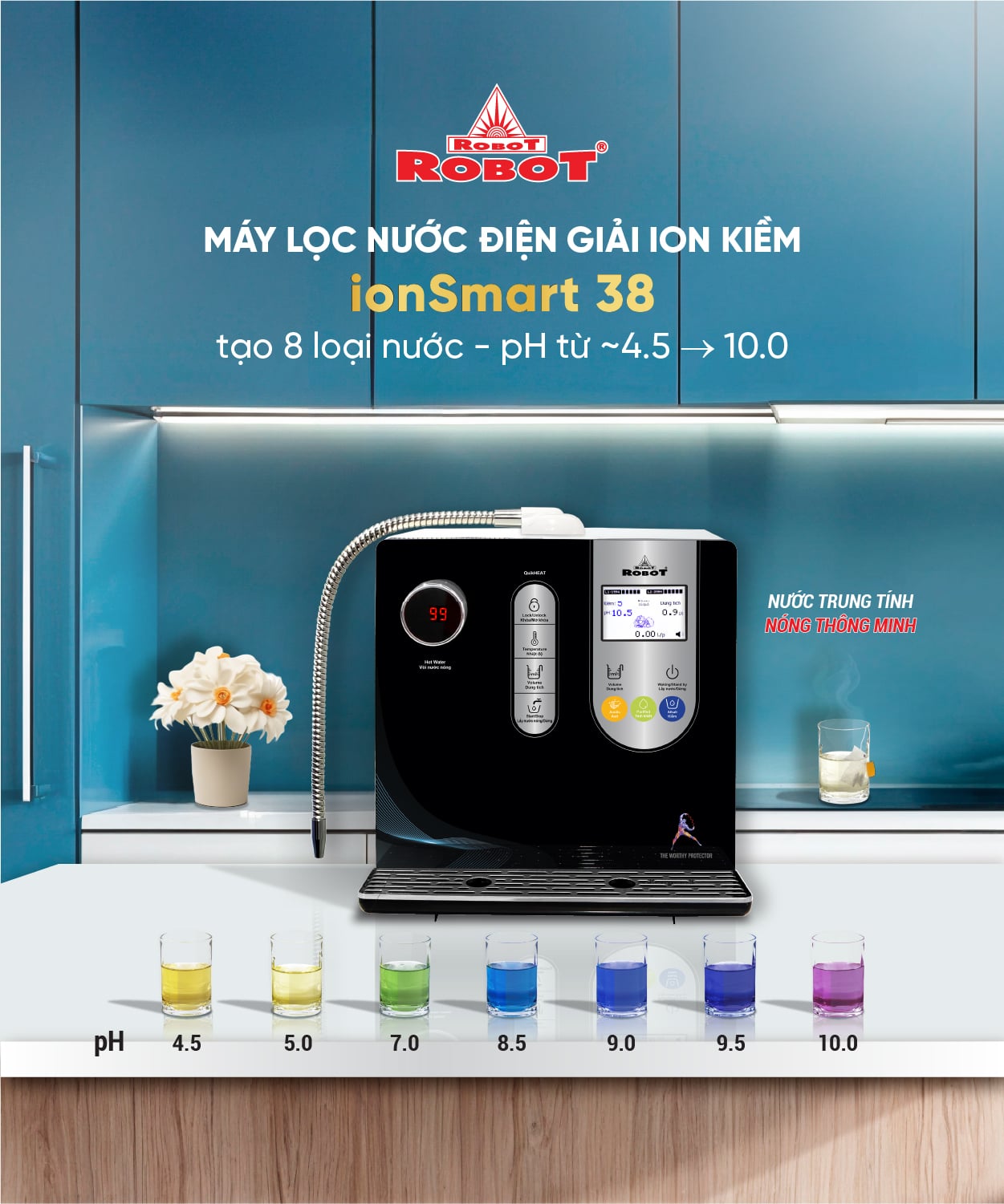 Máy lọc nước điện giải ion kiềm ROBOT ionSmart 38 là model đặc biệt sản xuất với công nghệ điện phân tiên tiến, cao cấp trang bị đến 3 tấm điện cực kích thước lớn, có khả năng tạo ra đến 8 loại nước đa chức năng: