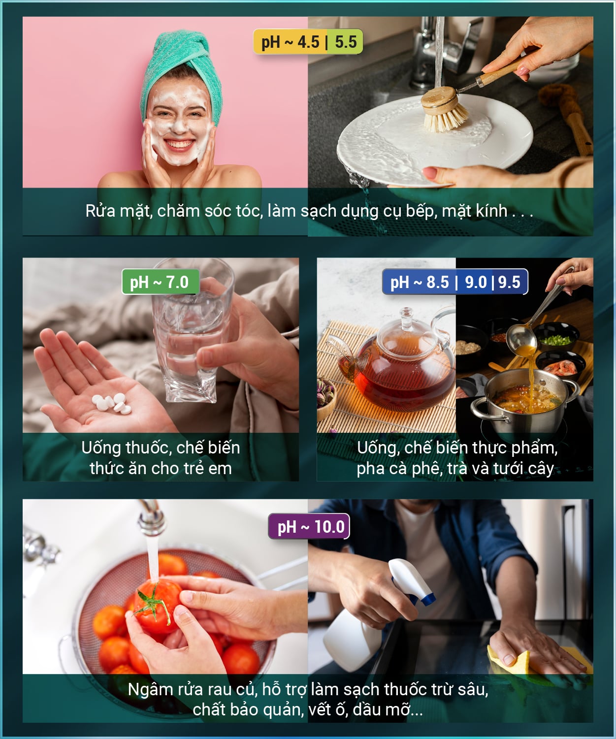 - Nước điện giải ion kiềm được tạo từ thiết bị điện phân ion hóa nước, tạo nhiều mức nước có pH, Hydrogen, ORP khác nhau với nhiều công năng sử dụng, không phải là thuốc và không có tác dụng thay thế thuốc chữa bệnh.