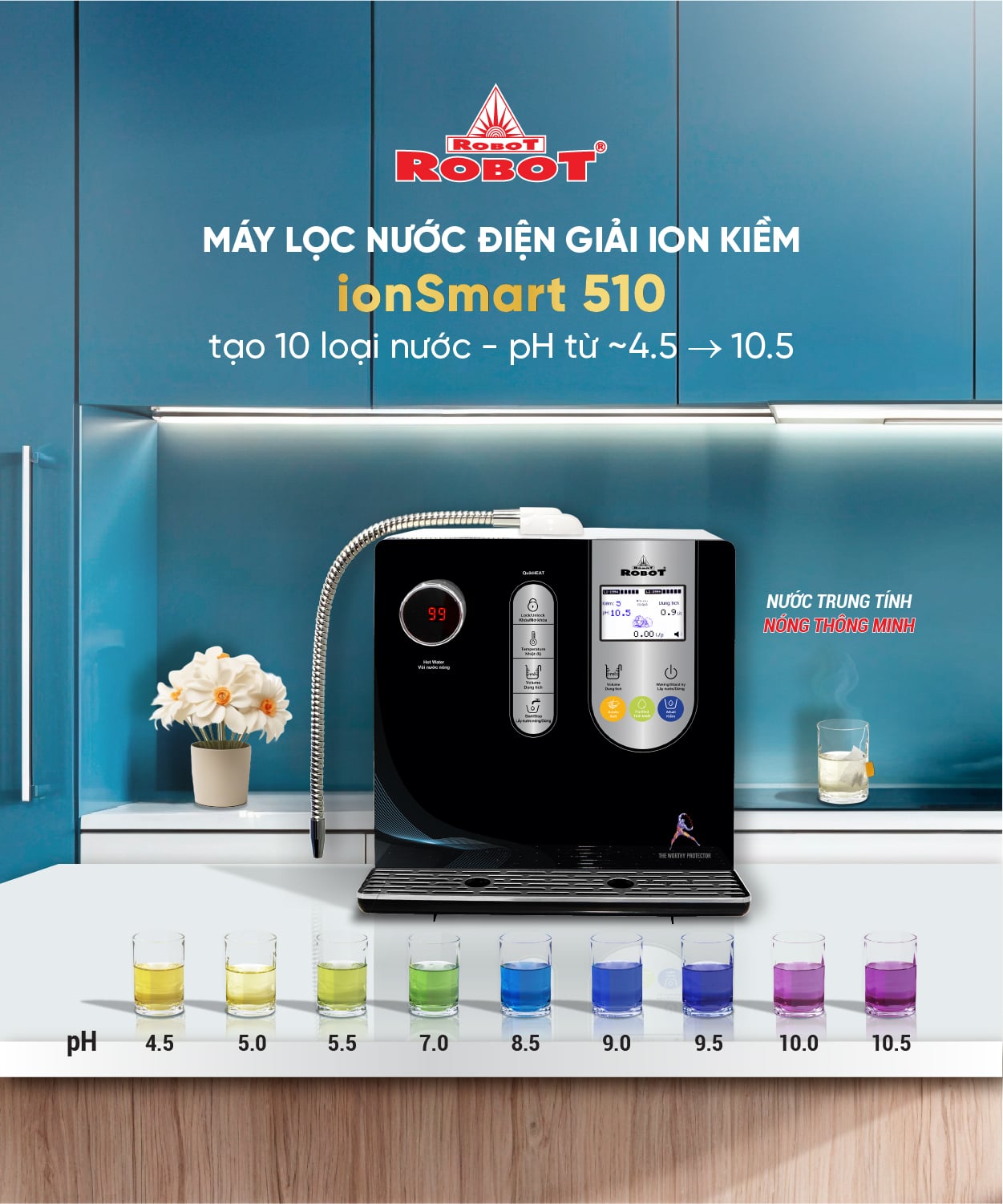 Đặc biệt, ROBOT là nhà sản xuất đầu tiên trên thế giới sản xuất dòng Máy lọc nước điện giải có thêm chức năng tạo nước Nóng thông minh, tùy chọn dung tích và nhiệt độ nước nóng các mức 45/60/80/99 độ C, lấy ngay lập tức không cần đun nấu và chức năng nước Lạnh từ 10-12 độ C, đạt Kỷ Lục Việt Nam, Châu Á và Thế Giới (tham khảo thông tin các model ionSmart, ionQueen, ionKing).