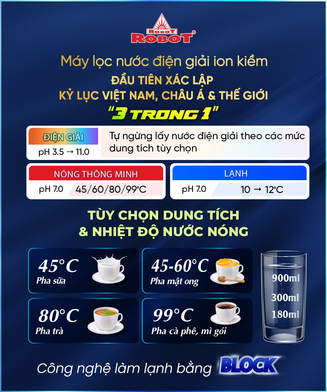 Đặc biệt, ROBOT là nhà sản xuất đầu tiên trên thế giới sản xuất dòng Máy lọc nước điện giải có thêm chức năng tạo nước Nóng thông minh, tùy chọn dung tích và nhiệt độ nước nóng các mức 45/60/80/99 độ C, lấy ngay lập tức không cần đun nấu và chức năng nước Lạnh từ 10-12 độ C, đạt Kỷ Lục Việt Nam, Châu Á và Thế Giới (tham khảo thông tin các model ionSmart, ionQueen, ionKing).