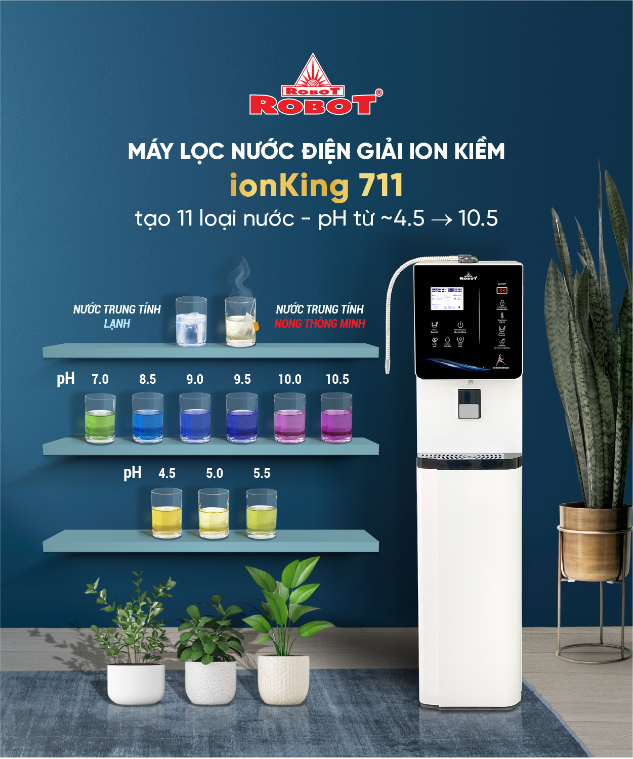 Máy lọc nước điện giải ion kiềm ROBOT ionKing 711 là model đặc biệt – đẳng cấp được trang bị đến 7 tấm điện cực, tạo ra nhiều mức nước pH với chỉ số Hydrogen & ORP đạt tối ưu, tích hợp đầy đủ chức năng ưu việt. Ứng dụng công nghệ điện phân tiên tiến Korea, là dòng máy điện giải cao cấp – độc đáo, khả năng tạo ra đến 11 loại nước đa chức năng: