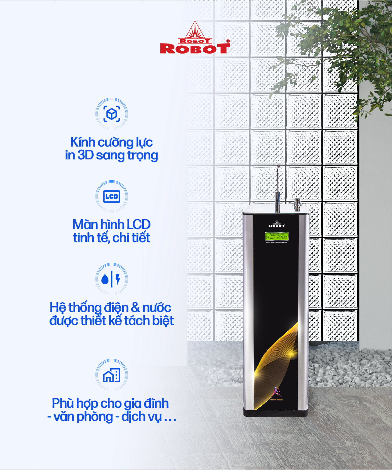 Máy lọc nước ROBOT Thế hệ mới có kiểu dáng hiện đại, tinh tế, phù hợp với nhiều không gian và phong cách nội thất khác nhau