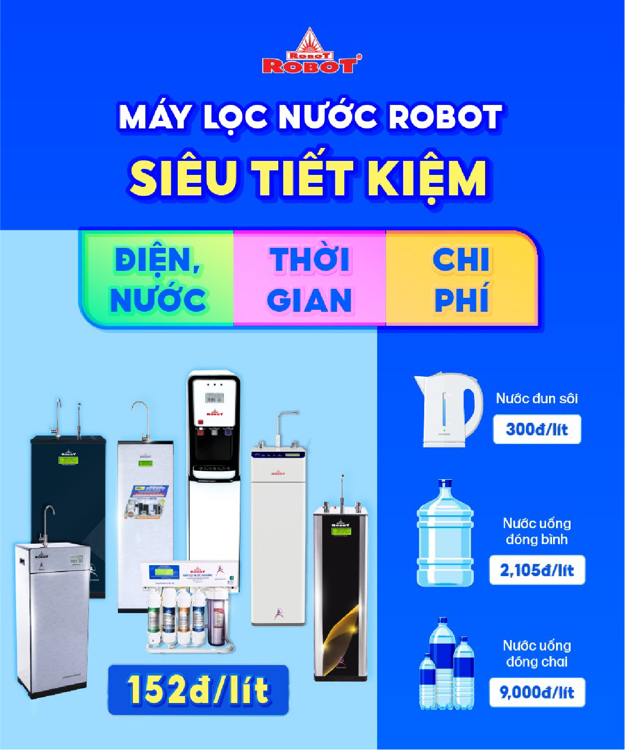 Sử dụng Máy lọc nước ROBOT giúp TIẾT KIỆM rất lớn chi phí sử dụng bình nước 20 lít, cũng như không tốn điện & thời gian khi phải đun sôi nước để uống.