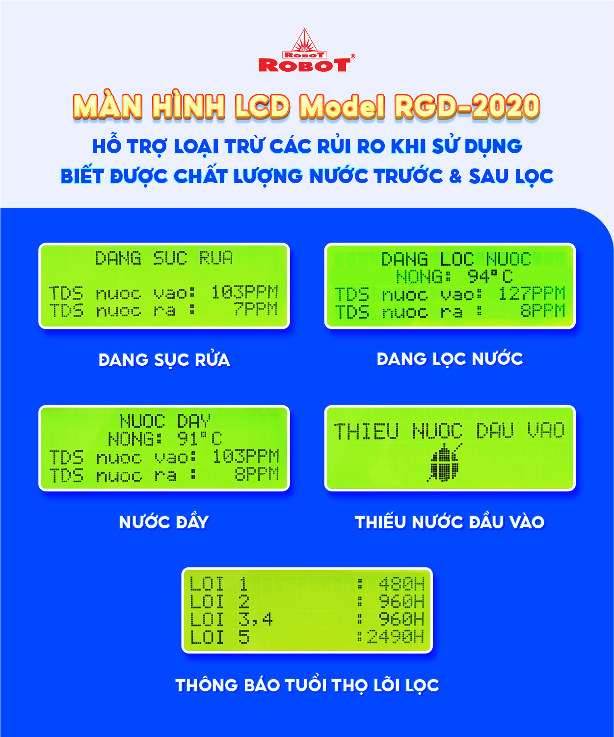 - Các sản phẩm máy lọc nước ROBOT đều sở hữu màn hình LCD sắc nét, hiển thị chi tiết các thông số TDS – chất lượng nước trước & sau lọc, tuổi thọ lõi lọc 24/24… để mọi người đều dễ dàng theo dõi hoạt động máy, chất lượng nước uống thông qua màn hình LCD, loại trừ các rủi ro, mang đến sự an toàn khi sử dụng.